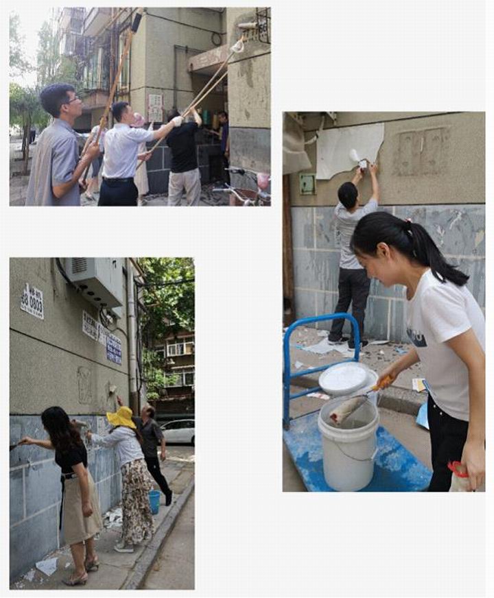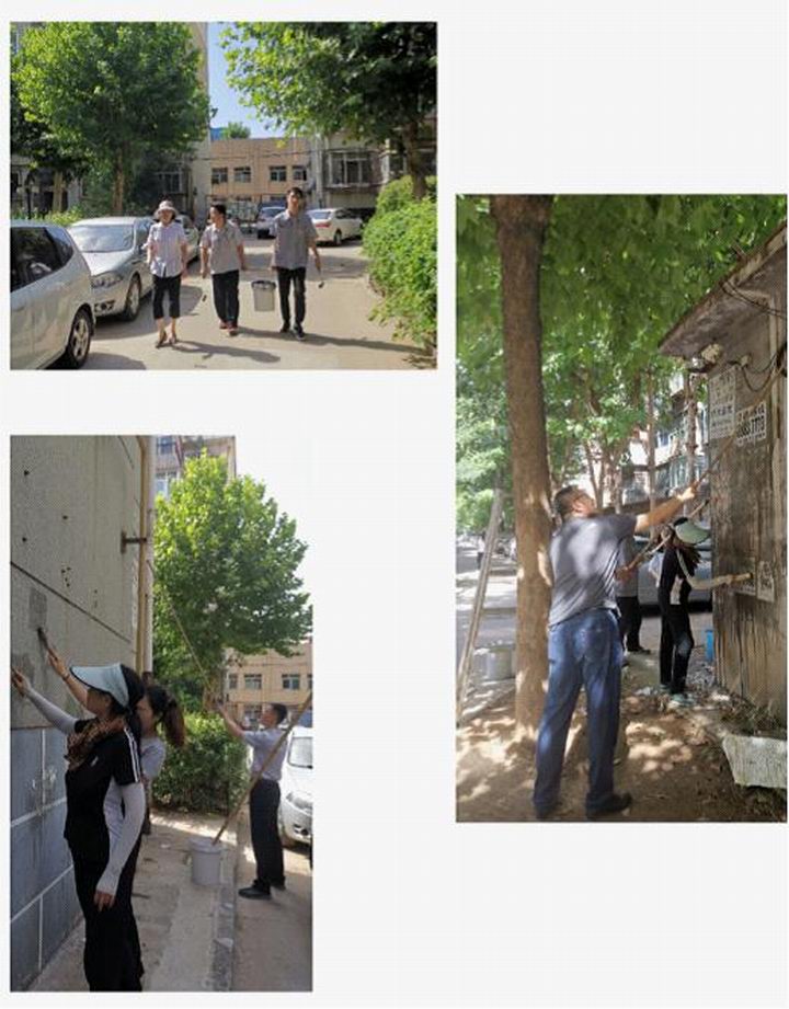 女同志們發(fā)揮優(yōu)勢耐心細(xì)致處理低處的小廣告,男同志們登高爬梯汗流浹背,沙子蹦到眼里、涂料濺到身上毫無怨言。