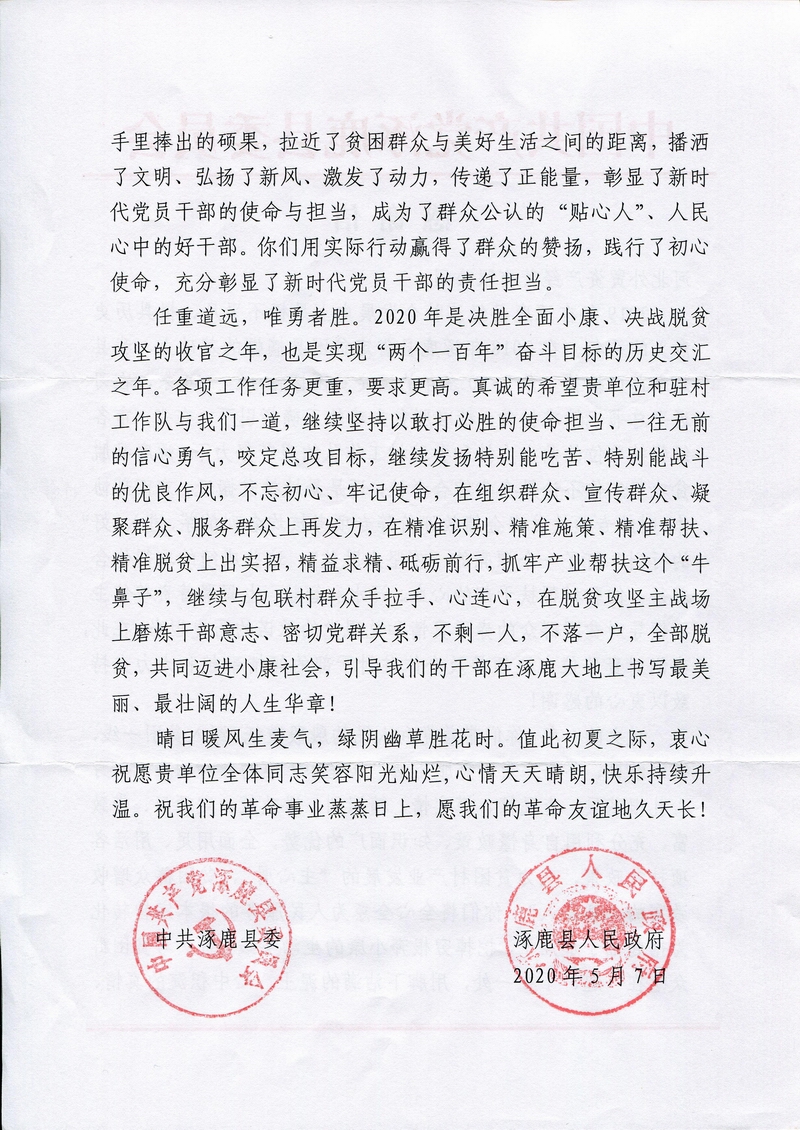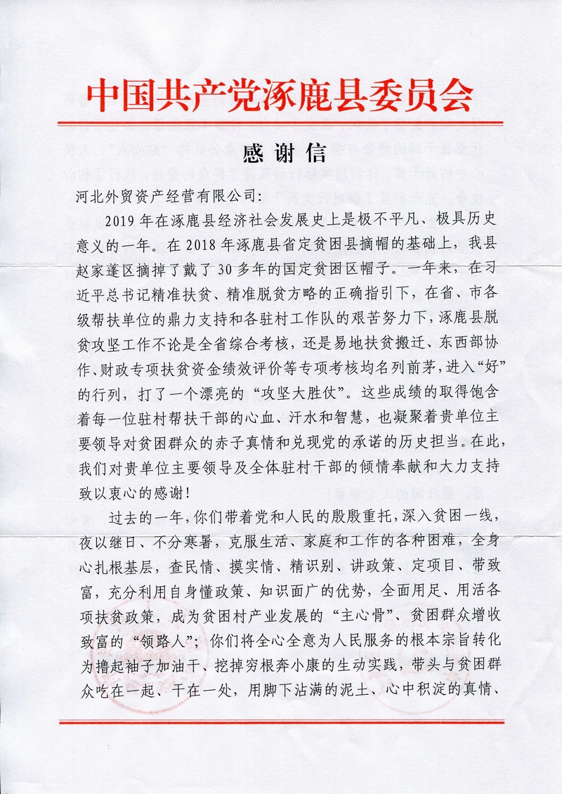 涿鹿縣委、縣政府致河北省外貿資產經營有限公司的感謝信