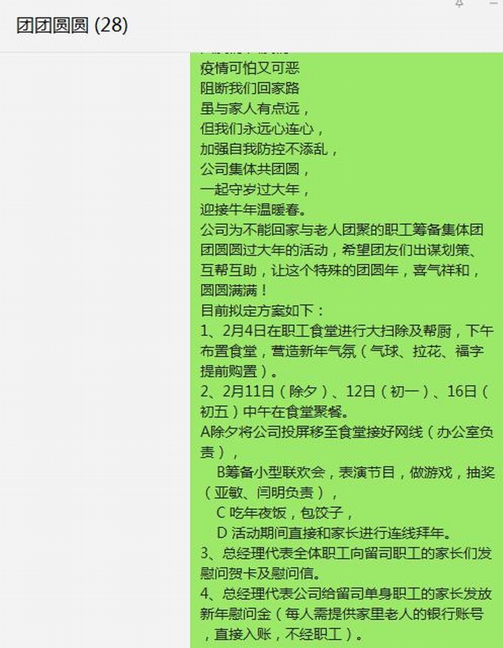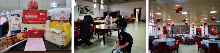 1月29日復(fù)工后立即召開總經(jīng)理辦公會專題討論研究活動實施方案,由共青團組織實施。對不能返鄉(xiāng)的同事們進行統(tǒng)計登記,建群成立臨時大家庭;由李澤峰總經(jīng)理親筆向不能返鄉(xiāng)同事的家長簽發(fā)慰問信及賀卡,表達公司的感謝和慰問,并直接向家長銀行賬號發(fā)放慰問金888元;按照傳統(tǒng)習(xí)俗臘月二十三組織團員們對公司食堂進行了大掃除,并進行裝飾布置營造新年氣氛;給留司的同事準備豐盛的年貨;水果、糖、堅果、熟食、面,讓大家安安心心過大年; 除夕公司食堂為大家準備了豐盛的年夜飯,黨委書記、總經(jīng)理和大家一起包餃子,看春晚,守歲迎新年,活動期間還要和家長們現(xiàn)場視頻連線,拜年送祝福;初一初五還有豐盛的團員餐大家一起分享。
