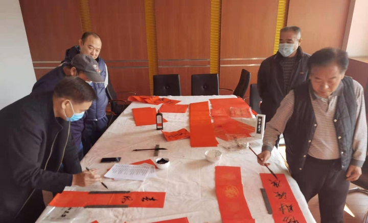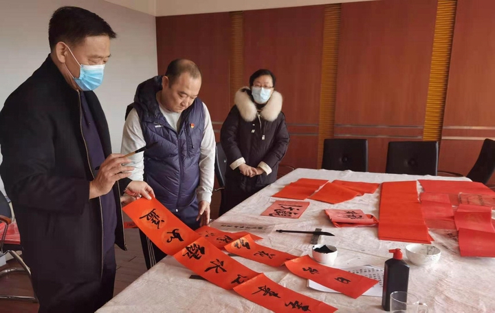 “無聯(lián)不成春,有聯(lián)春更濃”,過年中最具儀式感的事,莫過于精心準備幾幅春聯(lián)。為表達對在前階段居家防控疫情期間,廣大干部職工積極防疫并就近參加志愿服務(wù),為疫情防控工作做出貢獻的敬意,并為“十四五”開好局鼓舞斗志、凝聚力量,統(tǒng)籌疫情防控和高質(zhì)量發(fā)展兩手抓、兩不誤,營造喜慶祥和的新春佳節(jié)氛圍,在春節(jié)來臨之際,機關(guān)工會組織有書法特長的同志們?yōu)榇蠹覍懘郝?lián)、送祝福。在活動現(xiàn)場,楊景山、王金鑫、楊貴海、武濤為大家精心書寫了一幅幅紅彤彤的春聯(lián)和“福”字一份份新春的祝福在筆端流淌。公司駐地抗疫志愿服務(wù)者和職工紛紛到現(xiàn)場挑選心儀的春聯(lián),書寫現(xiàn)場接受“人訂制”,以滿足大家的個性化需求,濃濃的年味兒撲面而來。